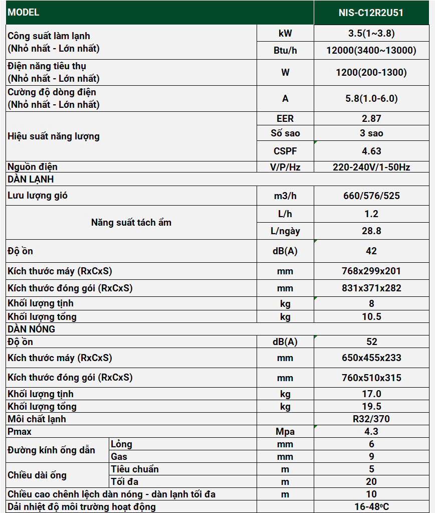 - Dòng NIS-CR2U51 – 1 chiều lạnh – 12000 BTU (1.5HP) – Gas R32